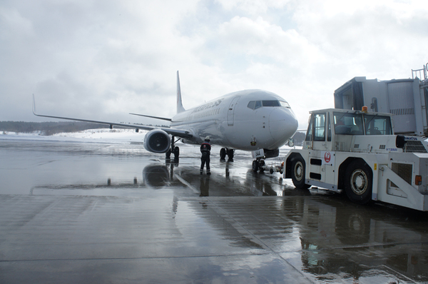 青森空港では、雪の影響などで滑走路に行くのに時間がかかるうえに、すぐ雪が積もってしまう。そこでJALでは、降雪状況や雪雲の動向によってはプッシュバック後自走する直前に除雪をする場合もある。これはJAL独自の工夫だという。除雪作業も実際に見学させてもらったが、確かに客が搭乗したことを確認して除雪作業にとりかかっていた。