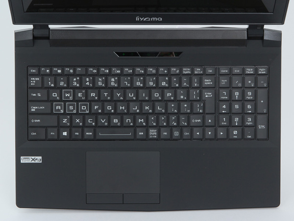 キーボードはテンキー付のものを採用。キーボード使用時に手のひらが付くパームレスト部分はラバー素材で、サラサラとした手触りの良い質感になっている。ゲームプレイしても、あまり手が汗ばむこともなく、かつひんやりとしているわけでもないので、快適に長時間使用できた。