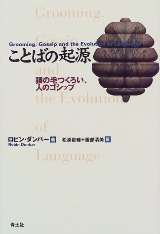 | イギリスの人類学者ロビン・ダンバーによる「ことばの起源―猿の毛づくろい、人のゴシップ」(青土社)。著者によれば言語発生の祖型はサルの小集団内での毛づくろい(グルーミング)にあり、現代の人間の世間話=ゴシップはその名残りであるという |