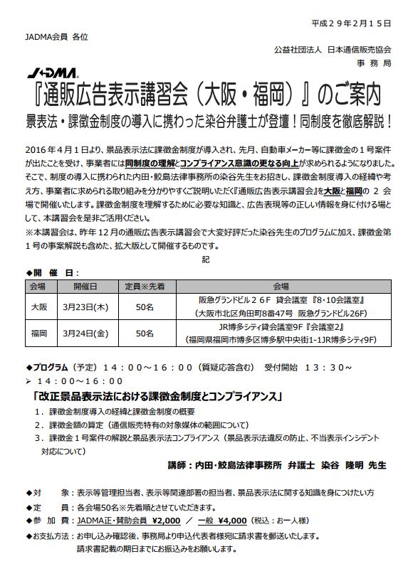 (公社)日本通信販売協会(JADMA)は3月23日と24日、大阪と福岡で「通販広告表示講習会」を開催する。