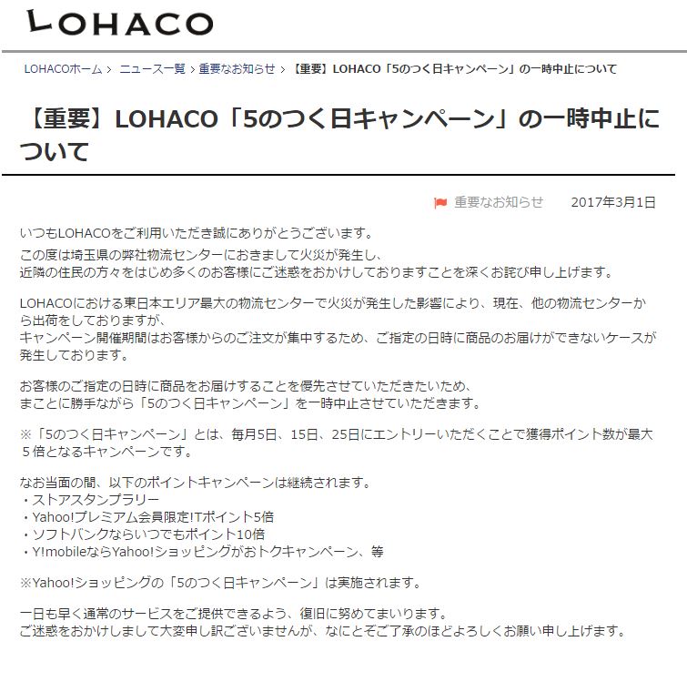 「5のつく日キャンペーン」は、「Yahoo!ショッピング」など、ヤフーグループのサービスで実施しているキャンペーンで、毎月5日・15日・25日にエントリーして商品を購入すると、獲得ポイント数が5倍になる。火災の影響で、現在同物流センターの配送エリアには、別の物流センターから出荷しているが、キャンペーン開催期間は注文が集中するため、指定の日時に商品が届けられないケースが発生している。このため、同キャンペーンを一時中止にする対応を取った。