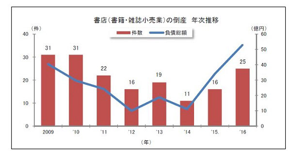東京商工リサーチが8日発表した「2016年『書店』の倒産状況」によると、出版不況により、16年に倒産した「書店」は前年比1.5倍増の25件となった。