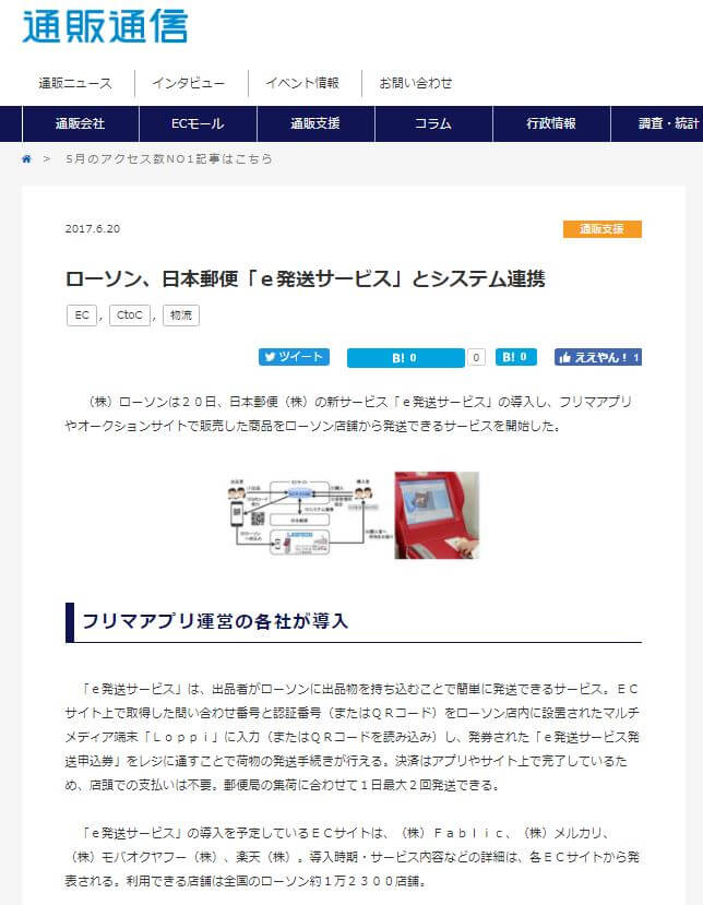 「e発送サービス」は、フリマアプリの「FRIL(フリル)」「メルカリ」「ラクマ」と、オークションアプリの「モバオク」「ヤフオク!」が導入しており、各アプリ・サイトでも同サービスが利用できない状況となっている。