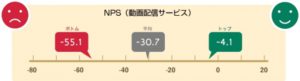 NPSは、家族や友人らにすすめたいかどうかで算出される指標で、推奨者(9~10ポイント)の割合から批判者(0~6ポイント)の割合を引いた数値がNPSとなり、数値が大きいほど高い評価となる。