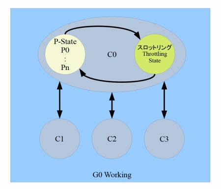 | ACPIでは、スロットリングをP-Stateとは別のThrottling-Stateであると定義する。ともにC0-State/G0-Stateとなる |
