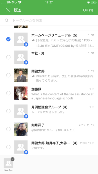 トークルームの作成画面で、右下の「+」をタップし、連絡先から自分だけを選択しても自分にトークが可能。自分を選択して、「OK」をタップすると、自分とのトークルームが開く。