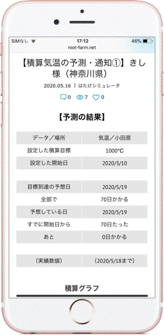 メール本文とリンクに案内されるページで、設定した目標積算気温に到達するまでの日数や到達予測日などを確認できます。