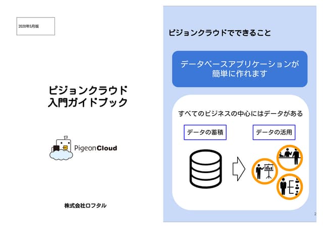 サービスURL:https://pigeon-fw.com/cloud ピジョンクラウドは、業務で扱うデータベースをプログラミングの知識不要で作成・管理できるクラウドサービスです。ブラウザさえあれば無料登録を行いすぐにサービスを利用することができます。様々な業務に応じたデータベースの作成、既存データのインポート、複数人でのデータの共有、データの集計や計算といった機能を提供します。