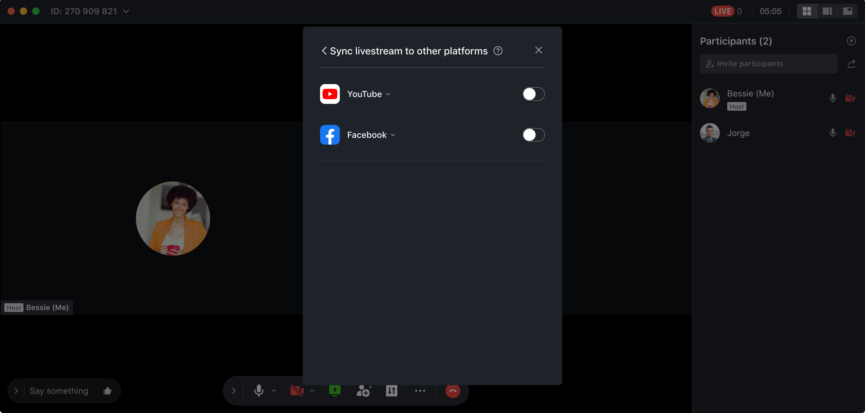 その後は、テレビ会議の画面から各プラットフォームへのライブストリーミングの同期を有効にすることができます。また、ライブストリーミングはいつでも停止・再開することができます。