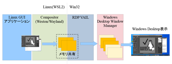 RDPには、すでにこうした仕組みが装備されていると考えられる。これをMicrosoftは、VAIL(Virtual Application Integreated Locally)と呼ぶ。この名称は、前述のRAILと対になることを想定してのものだ。VAILでは、仮想マシン内で行われたGUIアプリケーションのウィンドウ描画は、共有メモリを介して、ホスト側に渡す。通信を前提としないため、VAILを使えば、WSL2側(ゲストOS側)からのウィンドウ描画を高速にホスト側のデスクトップに表示できる。