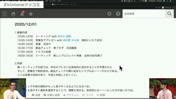 その日のスケジュールを書いておき、その後、業務に関するコメントをその場で入力していきます。テレワークなど働く場所が多様化して、仲間がいま何をやっているのか見えにくくなっていますよね。でも情報共有の専用アプリを作るほどでもない。そんなときに、ピープル機能を使ってみてください。