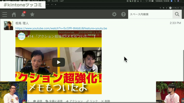 ぺそ:すみません、アプリ内には出ません。公式ホームページや、YouTubeをチェックしてください。YouTubeではアップデートによって「こういうことが便利になるよ」とわかりやすく紹介しているので、オススメです。スペースなどに短縮URLではないリンクを貼り付ければ、ブラウザ内でそのまま再生もできます。って、これはkintoneの機能ではなくYouTubeの仕様なんですけど。
