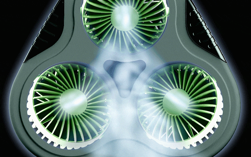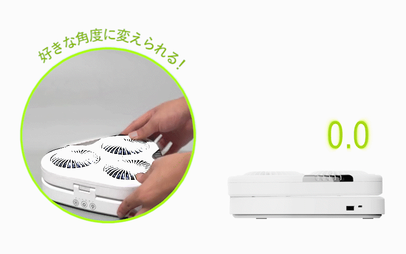 3つのファンを約13°内側に傾けると風が中央に集まり、ぶつかる事で拡散し自然な風が生まれます。まるで夏の日に吹き抜ける気持ちの良い風を再現します。エアコンの風が苦手な方や、通常の扇風機をデスクの上で使用する際に紙などが飛んでしまい困っている方にオススメです。