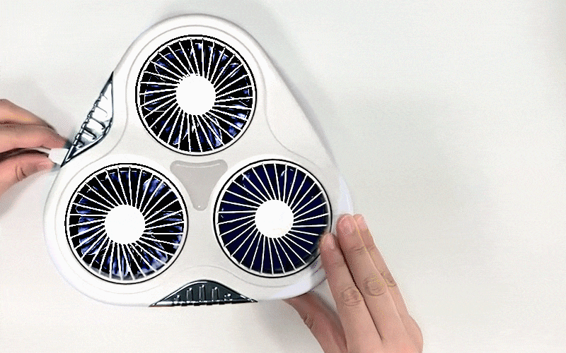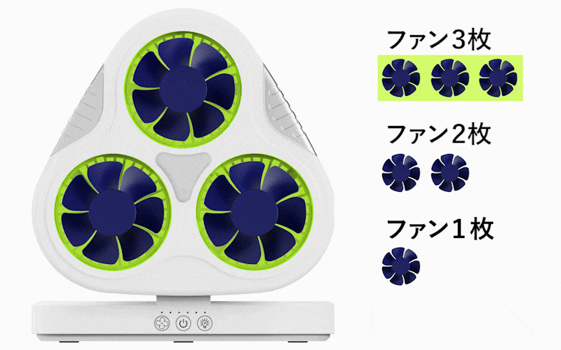 3つあるファンは、回転するファンの数を1~3枚まで選択することが可能です。電源ボタンを1回押すと3枚全てのファンが回転、2回押すと下2枚のファンが回転、3回押すと上のファン1枚のみ回転します。ご使用環境によってお好みでご利用してください。