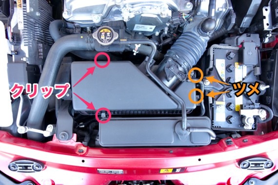 新品を入れる場合は逆の手順で押し込むだけ。フィルター面の平らな方が上。右の爪が差し込まれていること、外枠についたガスケットがクリーナーケースに当たっていることを確認して蓋を締め、クリップ2箇所を止めたらおしまい。