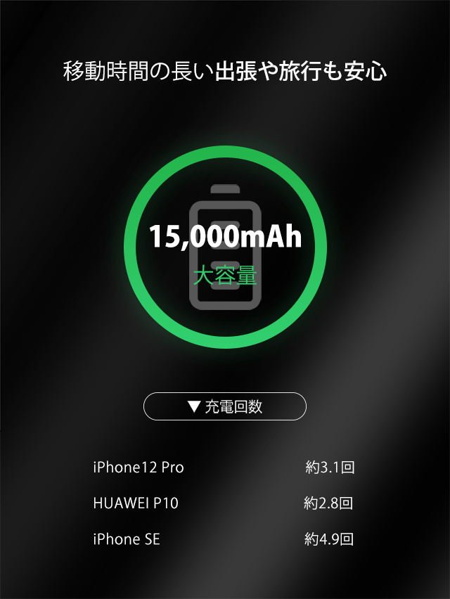 最新iPhone12を約3回、もっとも多く使用されているiPhone SEを約5回、画面の大きいiPad Pro 11を約1回フル充電できる大容量15,000mAh。