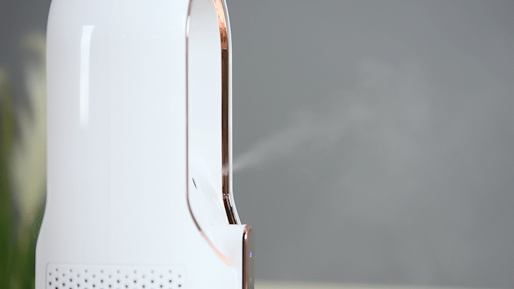 本体にすっぽりと収まる加湿器で、風と共にやわらかなスチームを生成する機能を備えています。