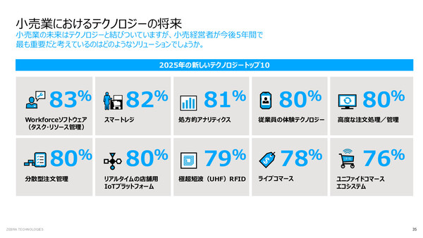 こうした課題に対処するため、小売経営者はテクノロジー投資/導入を加速させている。今回の調査によると、パンデミックの影響で「テクノロジー投資計画が加速された」と回答した小売経営者は61%、同様に「デバイスとソリューションの導入計画が加速された」は77%に及んだ。また、小売店従業員の61%もモバイルデバイスなどテクノロジーの供給について肯定的にとらえている。この61%という数字は、前年比で10ポイント以上の増加だという。