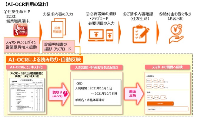住友生命ホームページのお客さま専用ページや営業職員のタブレット端末を通じた給付金請求において、医療機関から発行される診療明細書の撮影・アップロードすることで、入院期間や手術名等をAI-OCRで読み取ります。読み取った情報はお客さまのパソコンやスマートフォンに反映する機能を搭載し、請求情報入力にかかるお客さまのご負担を軽減します。