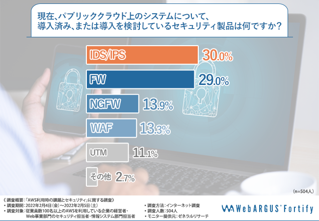 「現在、パブリッククラウド上のシステムについて、導入済み、または導入を検討しているセキュリティ製品は何ですか?」と質問したところ、『IDS/IPS(30.0%)』と回答した方が最も多く、次いで『FW(29.0%)』『NGFW(13.9%)』『WAF(13.3%)』と続きました。