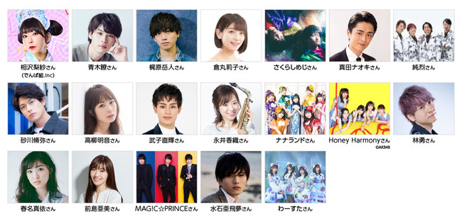 相沢梨紗さん(でんぱ組.inc)、青木瞭さん、梶原岳人さん、倉丸莉子さん、さくらしめじさん、真田ナオキさん、純烈さん、砂川脩弥さん、高柳明音さん、武子直輝さん、永井香織さん、ナナランドさん、Honey Harmonyさん、林勇さん、春名真依さん、 前島亜美さん、MAG!C☆PRINCEさん、水石亜飛夢さん、わーすたさん