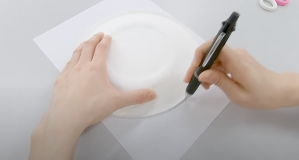 紙皿をそのままはさみで切っても良いですが、左右の重さや長さが変わってしまうと回りにくくなるため、紙を使って均等に作れるように工夫してみました。まずは、紙皿の大きさになるようにシャープペンシルで印をつけて紙を丸く切ります。
