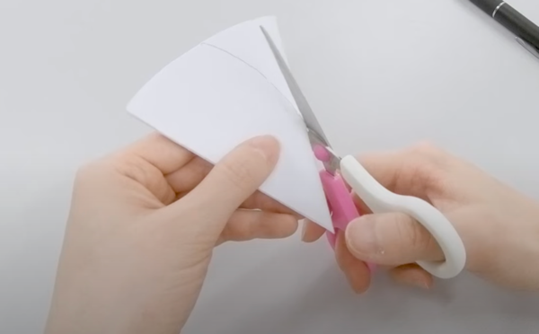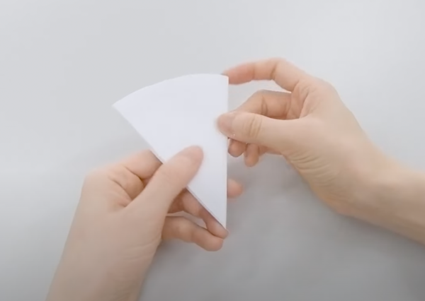 切った紙を半分に折っていきます。たとえば3回、半分に折りつづけると写真のような形になります。