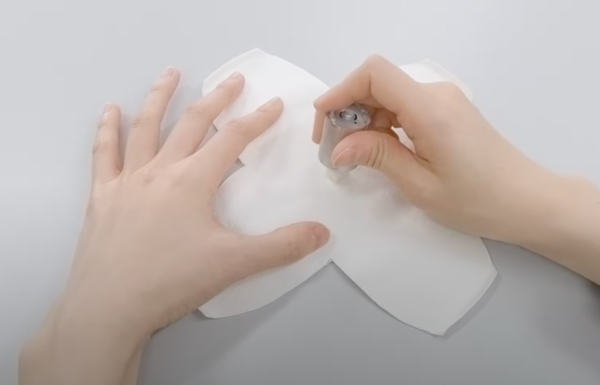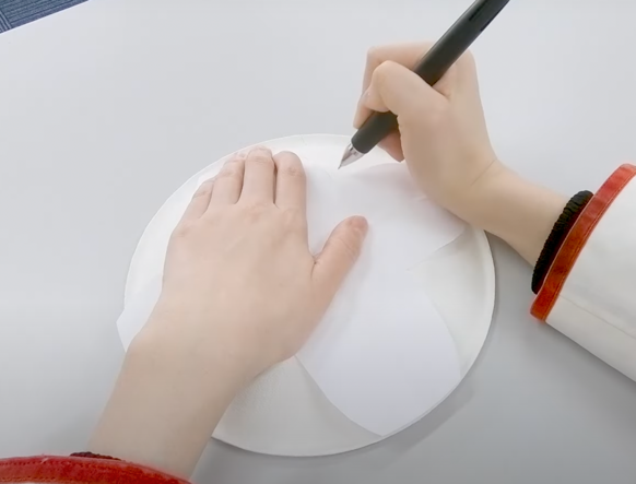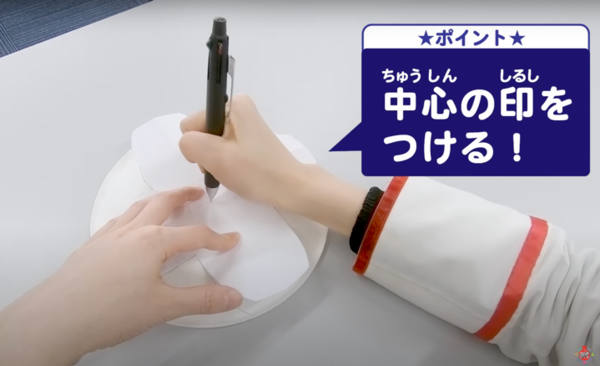 作った形を紙皿にシャープペンシルで写して、はさみで切っていきます。このとき、型紙の中心にシャープペンシルを強めに刺して、紙皿においても中心がどこか分かるようにしておいてください。