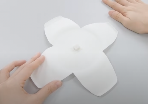 先ほど印をつけた紙皿の中心の位置(紙皿の裏側)に、小さく切った消しゴムを両面テープで貼ります。取れないようにしっかりと貼り付けてください。