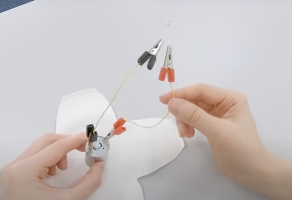 消しゴムに刺したモーターとLEDをワニ口クリップで写真のようにつなぎます。LEDには繋ぐ向きがありますが、光るかどうかはモーターが回る方向にもよりますので、のちほど付け替えて調整してください。