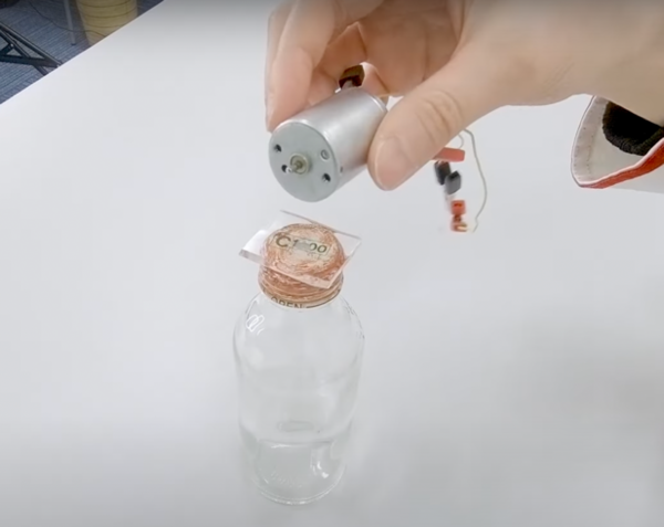 瓶の蓋の部分にハサミで切った耐震マットを置き、その上にモーターを乗せます。このとき、ブレードが瓶や耐震マットにぶつからないようにモーターの位置を調整してください。