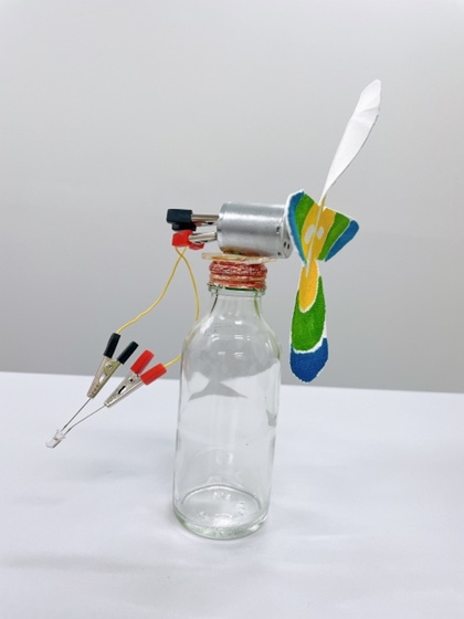 それではいよいよ、扇風機やうちわの風や外の風に当ててみます。ブレードが回らない場合は、全てのブレードを同じ方向に折り曲げて実験してみましょう。また、LEDが光らない場合は、プラスとマイナスを入れ替えてつなげてみましょう。