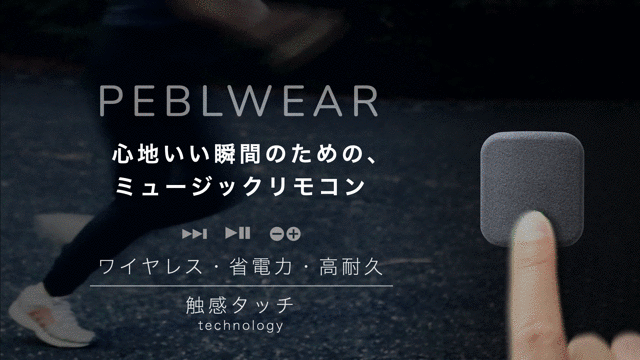 いまこの瞬間に、ベストな曲を、ベストな音量で。心地いい瞬間のためのミュージックリモコン「PEBLWEAR」。街から山までどんなアクティブシーンでも容易に音楽のコントロールを可能にするため、新感覚のタッチテクノロジーを採用。手元を見ずに、指先の小さな動き一つで音楽の操作が可能になりました。