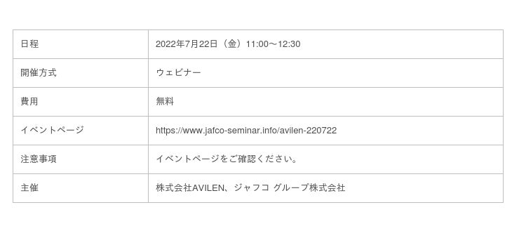 株式会社AVILEN(東京都中央区、代表取締役:高橋 光太郎、以下「AVILEN」)は、ジャフコ グループ株式会社(本社:東京都港区、取締役社長;三好 啓介)と共同で、2022年7月22日(金)11時から、オンラインセミナー『量子コンピュータがもたらす未来から考える。今から取り組むべきAI・DX戦略 』を開催します。 このセミナーでは、『見えている未来』から逆算して、今、私達が取り組むべきデータ利活用・AIやDX戦略についてお伝えします。 この機会にぜひご参加ください! <イベント詳細ページ> https://www.jafco-seminar.info/avilen-220722