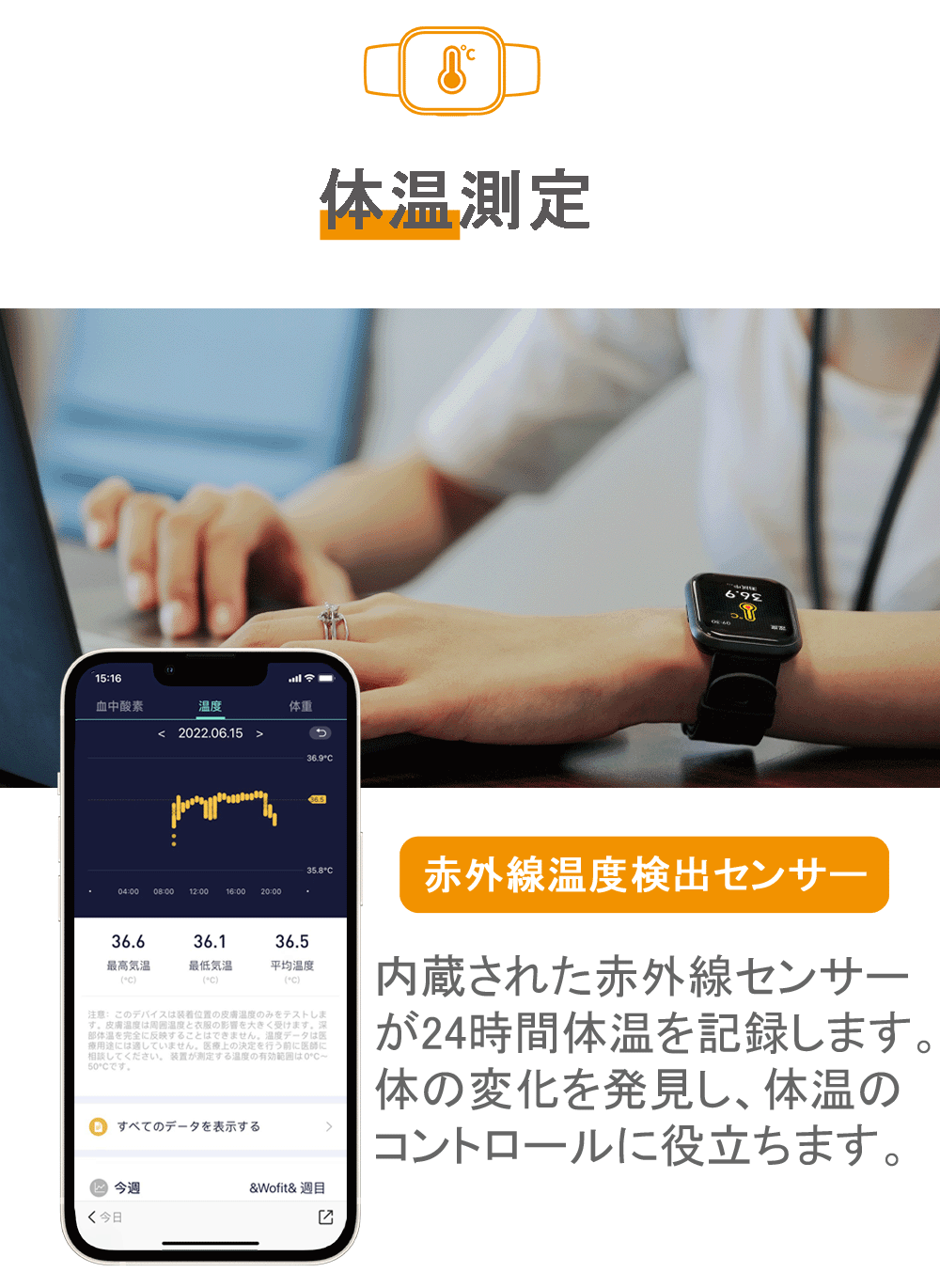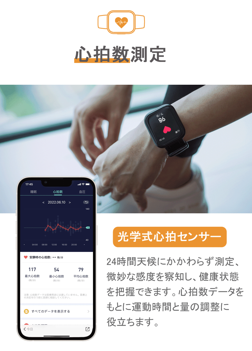 運動量だけでなく心拍数・体温測定、そしてスマートフォンと連動しメッセージ通知や音楽コントロールと手元で完結させたい機能だけをこの一台に集約しました。