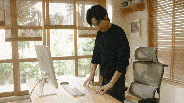 COFO Deskの昇降範囲は63cm~128cmと非常に幅広く、身長や使用環境を問わずに作業スタイルを調整できます。安定性と静音性に優れた三段式ピラミッド脚とデュアルモータードライブを採用し、耐荷重は頼もしい125kg、天板の厚みは従来のワークデスクを上回る3cmです。