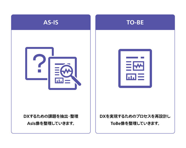 また、DXを実現するためには、従来通りのプロセスのままシステム導入するのではなく、プロセスを再設計する必要があります。お客様毎のAS-IS像/TO-BE像を整理していきます。