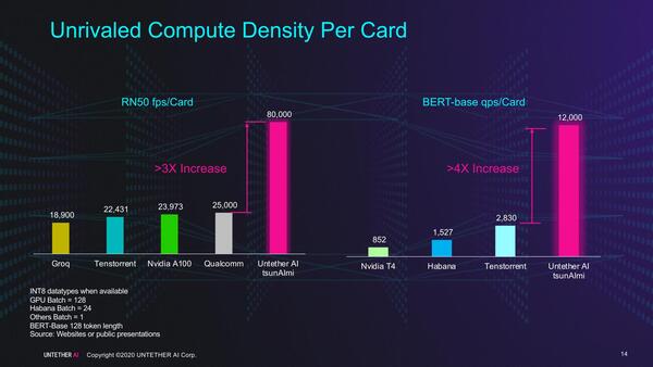 このグラフは純粋にTOPS値を比較したもので実際の性能はまた別だが、実際にResNet-50やBERTの結果では競合製品を大きく上回る性能で、また消費電力あたりの性能で見ても競合の2倍以上の効率としている。