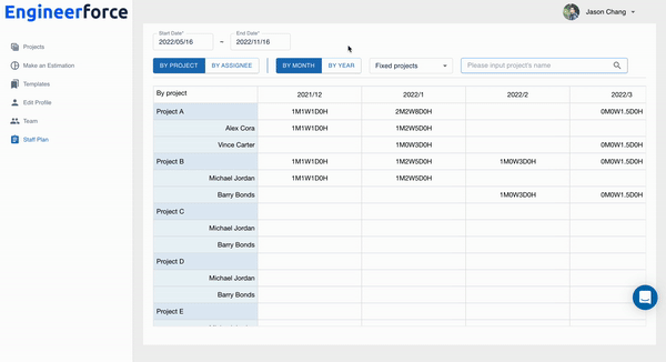 Engineerforceで見積もりを作成すれば、プロジェクト / 担当者毎に要員計画を作ることができます。