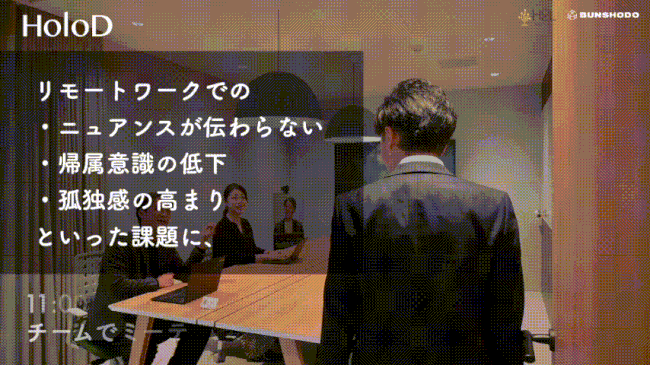 そこで、文祥堂とH2Lは、リモートワーク用ホログラム装置「HoloD(ホロディ)」を開発しました。HoloDでリモートワークすることで、これらの悩みを解決できるだけでなく、これまでとは異なる全く新しい遠隔コミュニケーションを体感することができます。