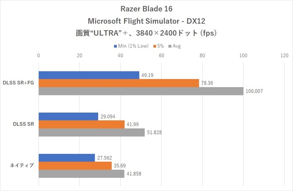 「Microsoft Flight Simulator」はAPIをDirectX 12、画質は“ULTRA”、アンチエイリアスはネイティブ時は“TAA”、それ以外はDLSS“パフォーマンス”に設定した。ランディングチャレンジ“シドニー”で一定時間飛行した時のフレームレートを計測した。カメラは常時機外後方に固定している。