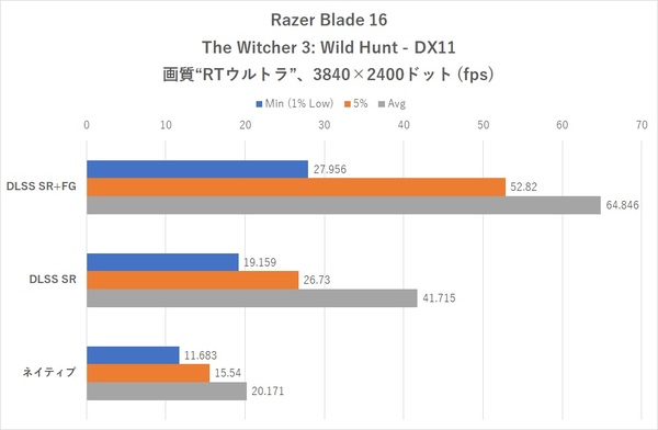 「The Witcher 3: Wild Hunt」では“RTウルトラ”、アンチエイリアスはネイティブ時は“TAAU”、それ以外はDLSS“パフォーマンス”に設定。RTウルトラでオフになるHairworksはオフで運用している。ノヴィグラド市中を移動する際のフレームレートを計測した。