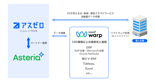 アステリア株式会社(本社:東京都渋谷区、代表取締役社長:平野 洋一郎、証券コード:3853、以下 「アステリア」)と、CO2排出量見える化・削減・報告クラウドサービス「アスゼロ」を提供するアスエネ株式会社(本社:東京都港区、代表取締役CEO:西和田 浩平、以下「アスエネ」)は、企業データ連携(EAI/ESB)製品の国内ソフトウェア市場で16年間連続シェアNo.1※1を獲得している「ASTERIA Warp」(アステリアワープ、以下Warp)のサブスクリプション(月額課金)型製品の販売代理店である「ASTERIA Warp サブスクリプション パートナー(以下ASP)」契約を締結したことを発表します。 CO2見える化クラウドと「Warp」の連携は初となり、アスゼロとERP※2などの様々なシステムのデータ連携が可能になります。