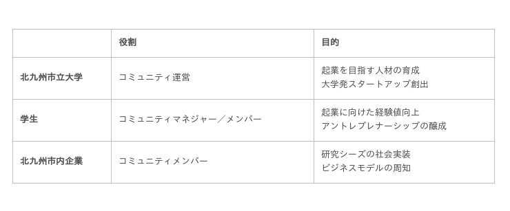 コミュニティメンバーは、「PARKS」※を構成する北九州市立大学や九州工業大学の学生や教員、北九州市内の企業及び先輩起業家を想定しており、北九州市が掲げる「SDGs未来都市」の実現に資する大学の主な研究テーマである「エネルギー、イノベーション、気候変動、陸上資源、都市建築技術」の5分野において関連性のある市内スタートアップ企業を誘致する考えです。