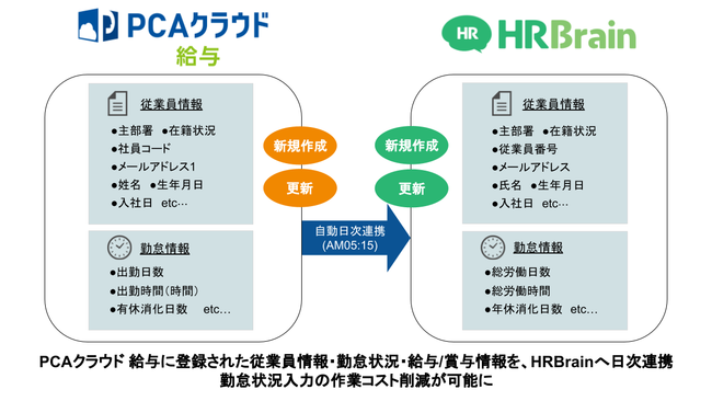 PCAクラウド 給与に登録している従業員情報(主職種、雇用形態等の組織情報を含む様々な情報)および勤怠状況、給与・賞与情報を毎日AM05:15にHRBrainへ連携する事ができます。