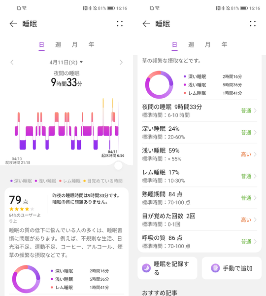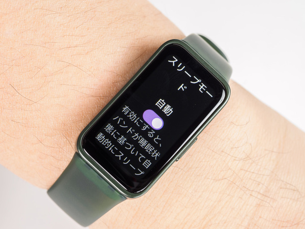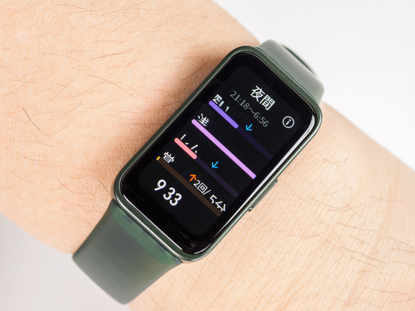 また、HUAWEI Band 8の画面でも、計測した睡眠データの詳細を確認できる点に注目。これまでは端末側では睡眠時間のみで、詳細を知るにはスマホ用の「HUAWEI Health」アプリ(Android/iOS両方に対応)が必要だったが、手元でチェックできる項目が増えた。なお、睡眠に関するアドバイスを読んだり、蓄積した週ごとや月ごとの睡眠データを確認するのは、HUAWEI Healthアプリから引き続き可能だ。
