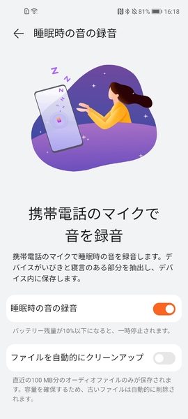 HUAWEI TruSleep™ 3.0での新機能では、「睡眠時の音の録音」機能も試してほしい。これは、ペアリングしたスマホのマイクを使っていびきや寝言を録音し、ファイルとして保存してくれるもの。睡眠不足が実は眠りの状態にあったという例は少なくない。大きないびきが続いたり、いびきが急に止まるなどの現象も把握できるため、自分の睡眠の質に不安がある人は一度試してみてもいいだろう。