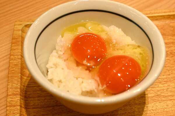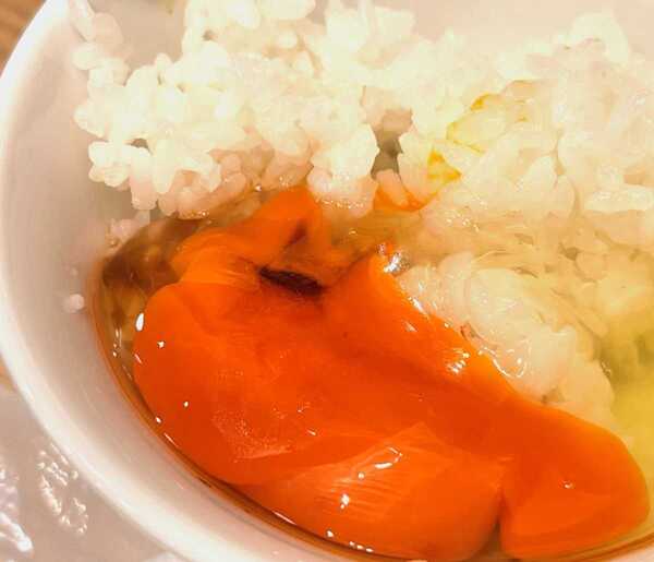 卵は殻の状態で提供されますが、割る時に殻の“かたさ”にびっくりしました。栄養たっぷりの健康な卵だから、硬度が高いんでしょうね。卵黄は濃いオレンジ色。牡蠣だしを使用した専用醬油でいただくと、たまらないおいしさ。