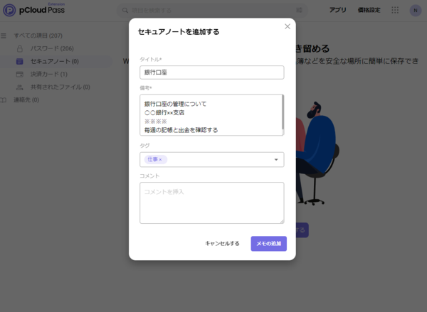 「セキュアノート」には、ちょっとしたメモを書き込める。誰にも知られたくない内容なら「pCloud Pass」に保存しておくことで、マスターパスワードを知っている自分しか見られないようになる。