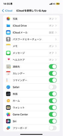 ・「iCloudを使用しているApp」から同期したいアプリをオンにし、同期したくないアプリをオフにします。